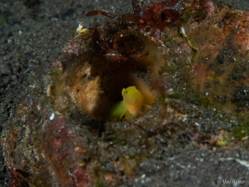 ミジンベニハゼ。インスタでよく見る黄色いかわいいハゼ。写真コンテストとかでもよく見る、ツボの中につがいでいたり、大きく口を開けていたり。ネットではよく見るのに、今まで見たことありませんでした。