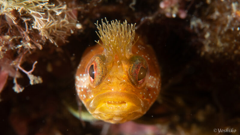 ギンポの仲間はこれまでもたくさん見たことがあって、たくさん種類がいるので、分類がよくわからない!でも川奈で潜るようになってからの頻出ギンポはこのコケギンポです。頭に生えている毛(?)がモヒカンみたいだし、クリクリした目が可愛いです。
