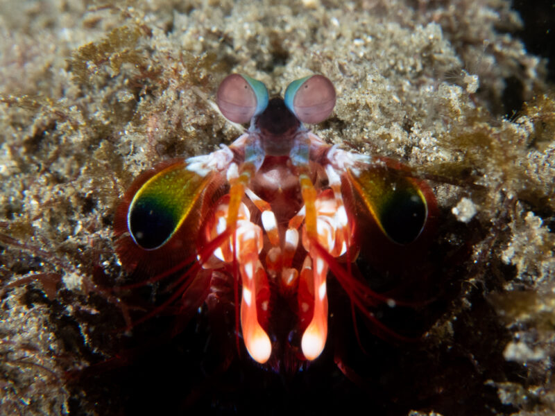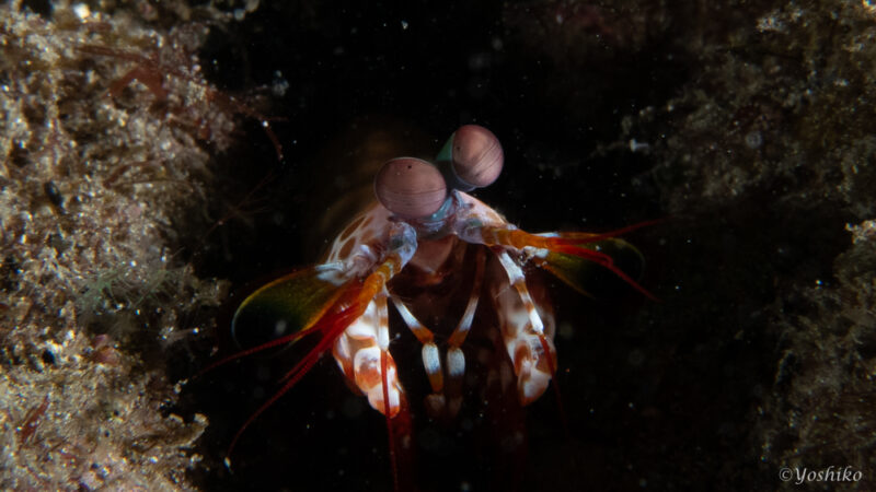 伊豆で出会う生き物たちは、「これまで見たことなかったー」というのが結構多いのですが(もとリゾートダイバー)、モンハナシャコはこれまで色んなところで見たことがあります。熱帯や亜熱帯の海域に生息するそうで、だからフィリピンとか沖縄とかでばっかり潜っていた私も前に見ていたことがあるんですね。