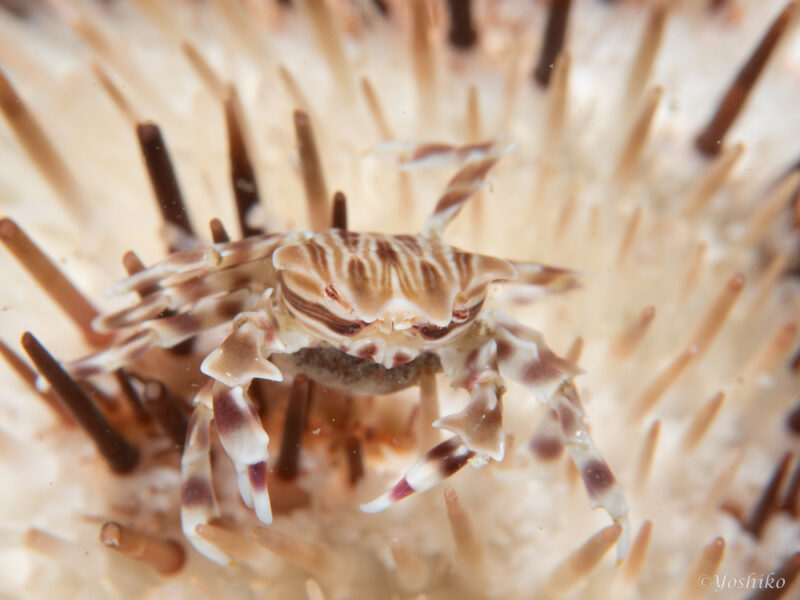 今日は、こういうトゲトゲのウニにのっているゼブラガニに遭遇しました。